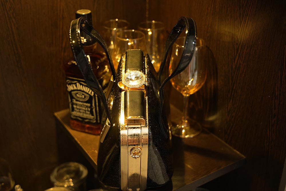 Wipe with a clean, dry cloth. Avoid contact with water, perfumes, or rough surfaces to maintain the embroidery and metallic finish.