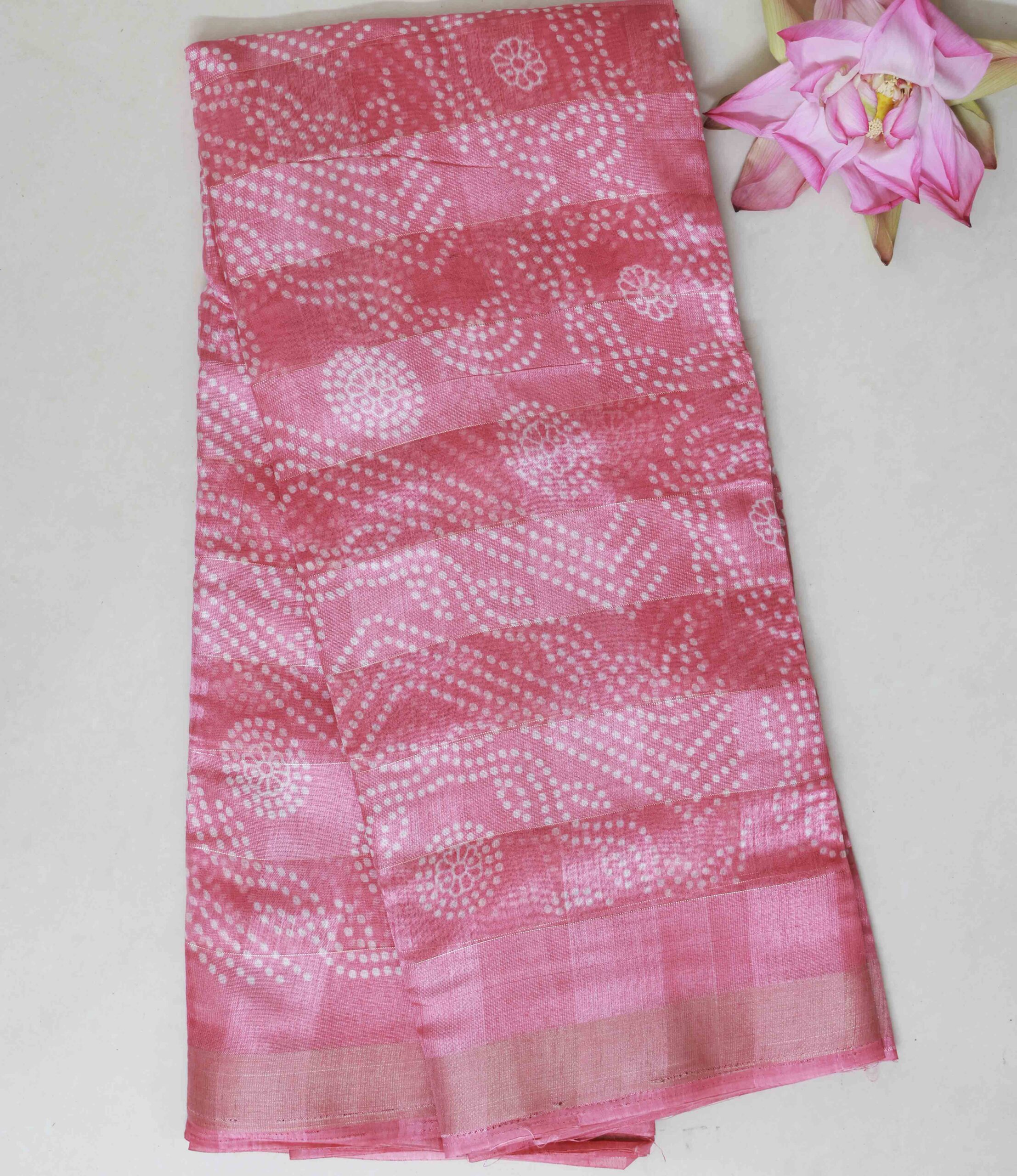 STYLESPOINTER Blush Pink Bandhani-Printed Cotton Saree – Soft Elegance in Every Fold