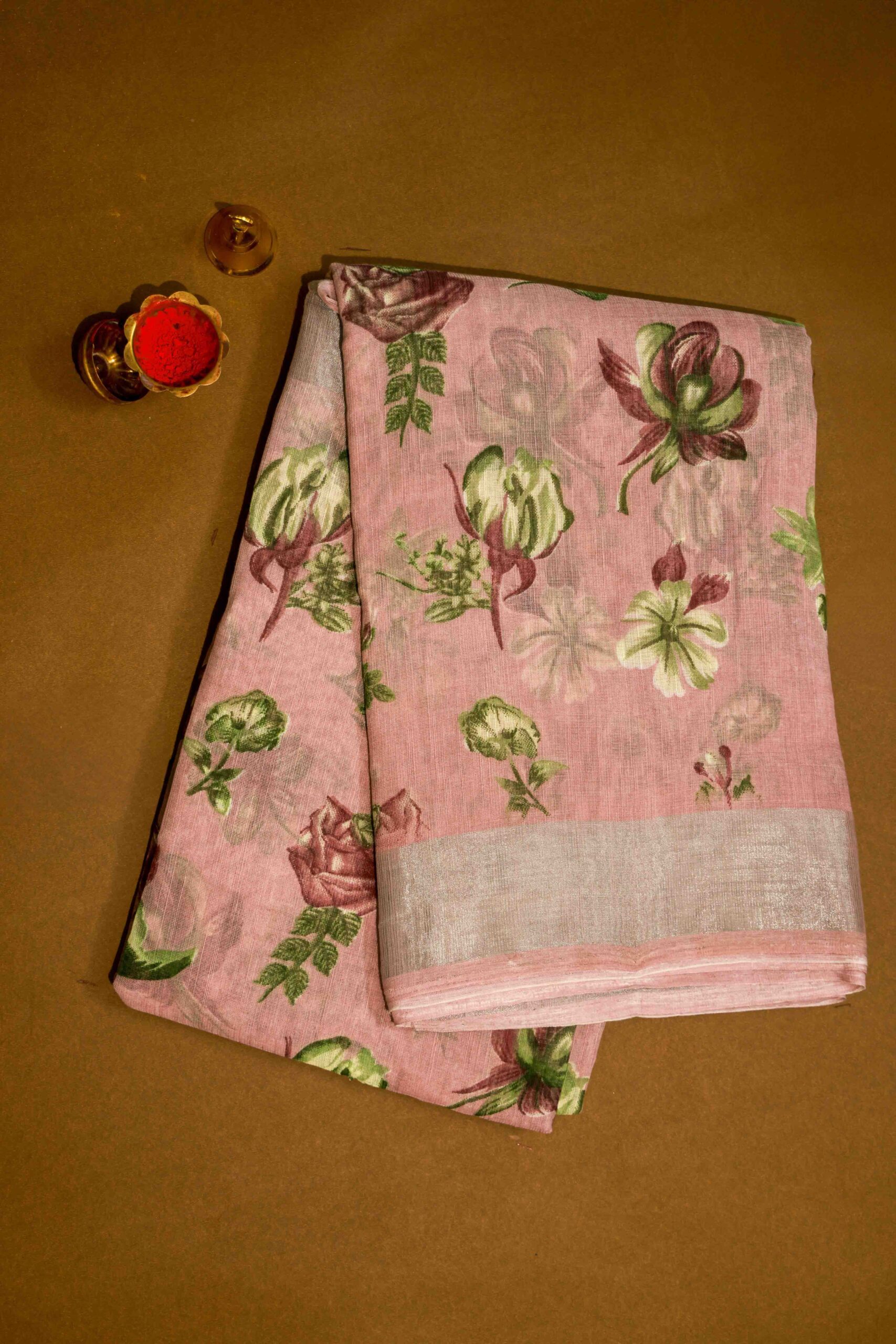 Elevate your everyday elegance with this soft pink cotton saree featuring a charming digital floral print. Light, breathable, and perfect for all-day wear.