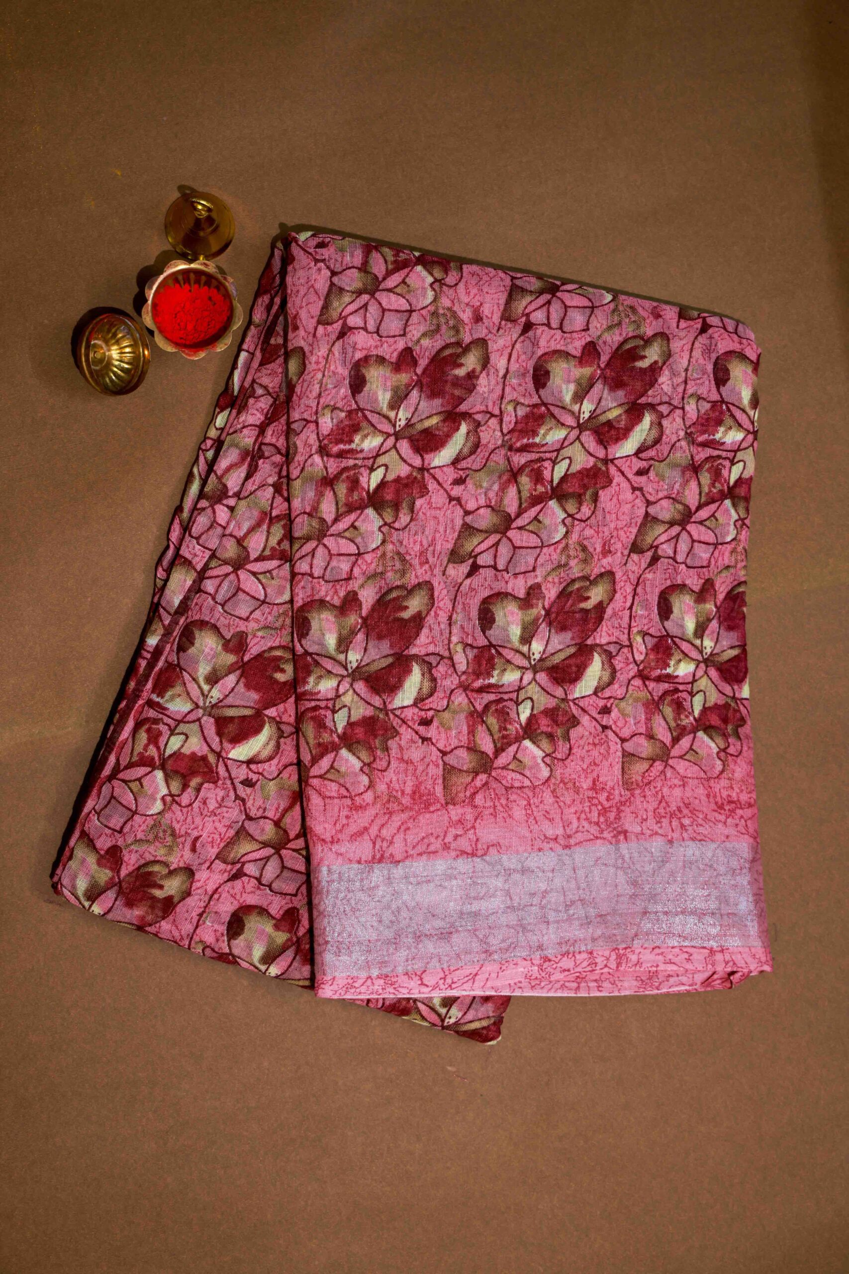 blend comfort with everyday elegance. Crafted from premium-quality cotton, this saree showcases a detailed floral pattern in rich maroon over a pink base, accented with a soft silver border for an added touch of sophistication.