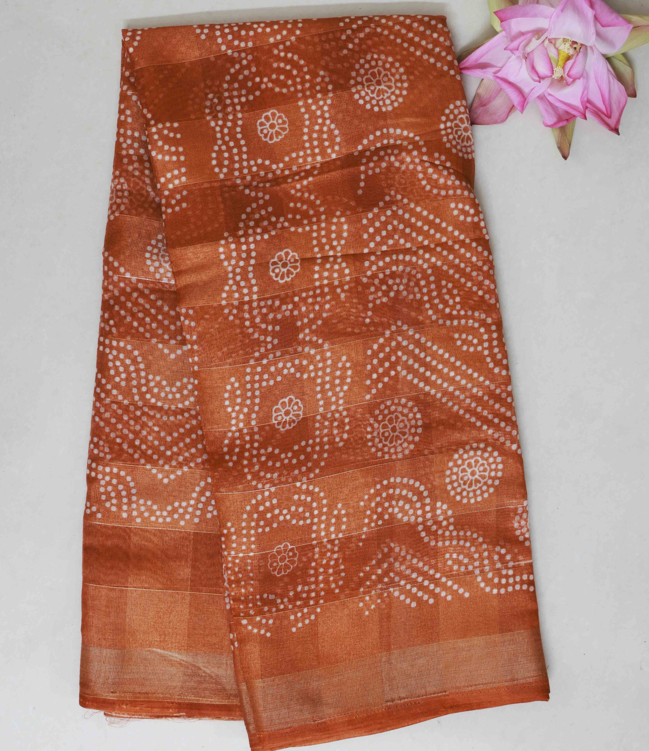 Stay cool and stylish with this rust orange Bandhani-printed saree cotton . Lightweight, breathable, and adorned with timeless prints—perfect for everyday elegance or casual festive wear.